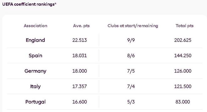 小组赛过后,英格兰在欧足联系数排名中遥遥领先,该排名衡量的是每个国家的俱乐部在本赛季欧洲三项赛事中的表现。只要英超能保持前两名的位置,那么联赛第五就能连续第二个赛季直接获得欧冠小组赛正赛资格。